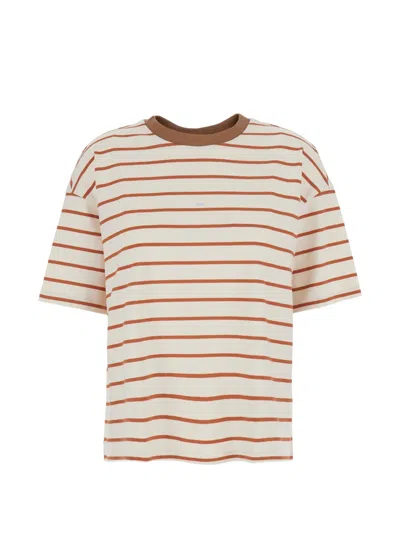 white horizontal-stripe pattern crew neck short sleeves dropped shoulders logo print to the front ribbed collar straight hem