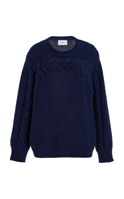 Founded in 2016 by designer Marina Cortbawi; Brooklyn-based Merlette thoughtfully crafts its garments from all natural; high-quality materials (cotton; wools and silks) with bespoke finishes â perfect for building a timeless wardrobe. The 'Serin' cableknit crew is a timeless addition to your knitwear collection. Crafted from 100% pima cotton; this full-length sweater offers unparalleled softness and breathability; making it a versatile choice for year-round wear. Its intricate cable stitch detailing lends texture and dimension; while the ribbed neckline; cuffs; and hem provide a structured yet comfortable fit. The long sleeves and classic crew neck silhouette make this a perfect layering piece.