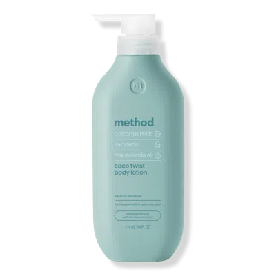 BODY LOTION COCO TWIST. Benefits: Leaves skin feeling silky and soft. Method Coco Twist Body Lotion is made without silicones, parabens + dyes. Helps support skin barrier function. 24-hour moisture for all day hydration. Smells like tropical nirvana with notes of coconut, avocado, and macadamia oil. Key Ingredients: Shea butter provides a soft and smooth feeling and helps moisturize while supporting the skin's natural barrier. Astrocaryum murumuru seed butter is known to treat skin conditions such as eczema and psoriasis. Avena sativa (oat) kernel ext helps smooth and calm skin. Formulated Without: Silicones. Parabens. Dyes.