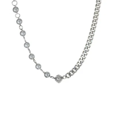 This bold statement necklace features a half-and-half design: a thick stainless steel curb chain paired with linked silver-plated hematite gemstones. At the center is our signature caged hematite sphere, representing strength, balance, and grounding energy. Crafted with durable, waterproof materials, this piece is designed for everyday wear — whether worn solo or layered. Materials: Stainless steel, silver-plated hematite gemstones