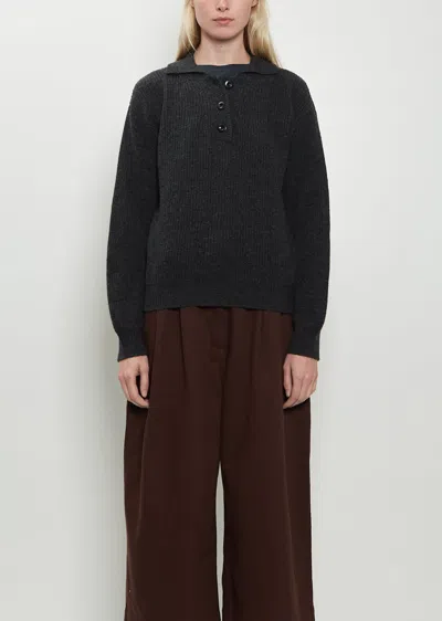 MHL by Margaret Howell charcoal grey polo with a three button closure at neck in a lightweight ribbed lambswool knit. Features dropped shoulders and contrasting ribbed trim finish at collar, placket, and cuffs. Regular fit. Sizing: Universal (XS-L). Abigail is 5' 10.5” (179cm) , bust 30”, waist 24”, hips 34” and wears a size small. Color: Charcoal. 100% Lambswool. Made in Italy. FW25MHL006