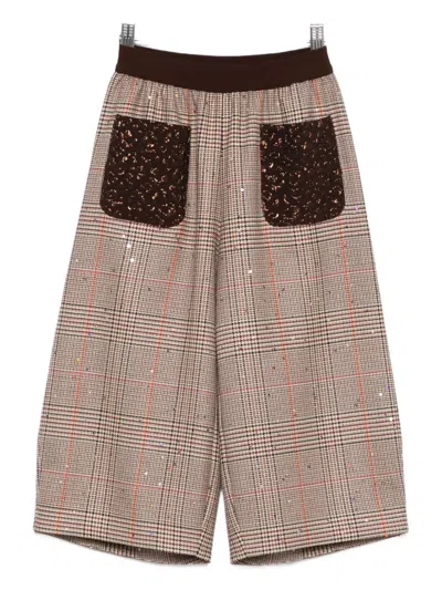 brown check pattern sequin embellishments patch pockets ribbed waistband wide leg