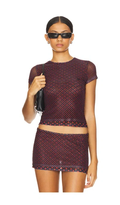 Miaou Iris Top in Black. Size L, M, S, XL, XS. 92% polyester 8% spandex. Made in China. Machine wash. Lining with larger polka dots. Mesh fabric. MAOU-WS302. 7184PM2BPD. Miaou is a collection of women's ready-to-wear popularized by designer Alexia Elkaim's coveted high-rise denim with a universally-flattering fit. Inspired by vintage flea market finds and 90's glam supermodels, Miaou brings in the effervescence of Paris, the casual chicness of New York, and the cool factor of Los Angeles - all cities where Elkaim was raised. The collection balances playful prints, sexy tailoring and mid-century French bombshell aesthetics for a hip and youthful retro-romantic vibe.