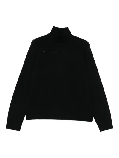 A luxurious black wool sweater that combines sophistication with comfort. Made from 100% premium wool, it showcases a high ribbed neckline along with ribbed cuffs and hem for warmth and style. The dense, smooth knit fabric provides versatility, making it suitable for casual and formal occasions. A small metallic logo detail on the chest enhances the minimalist design. 100% premium wool High ribbed neckline Ribbed cuffs and hem Dense, smooth knit fabric Small metallic logo detail on chest