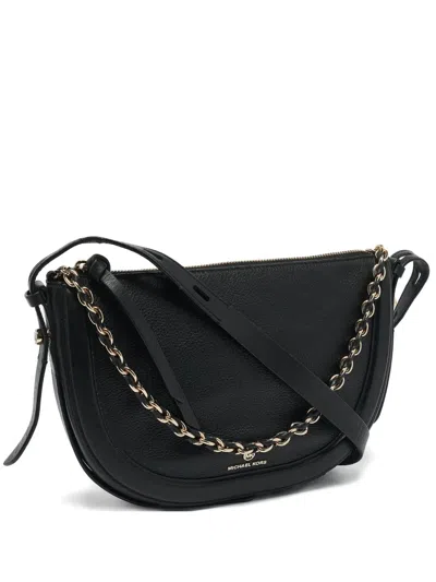 black leather construction crescent shape gold chain detail leather shoulder strap subtle stitching detail Condition: GOOD. This previously owned and used item is in good condition with minimal signs of use. This may include fading of material or plating and scratches