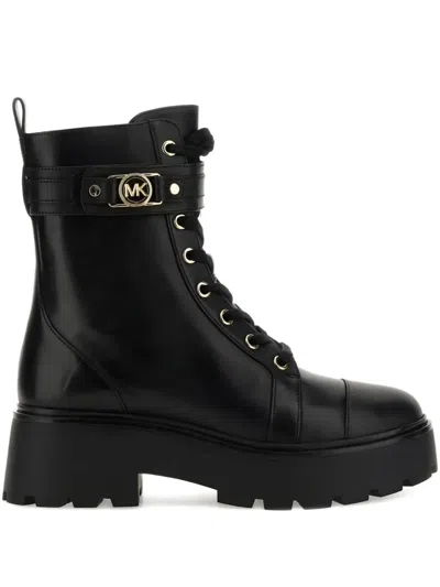 Timeless black cow leather boots from Michael Michael Kors feature a refined lace-up front and a sturdy platform sole. The smooth upper includes a decorative strap with the brand's logo, combining style and comfort for a chic appearance.- Material: Black cow leather - Closure: Lace-up front - Sole: Sturdy platform - Design: Decorative strap with logo