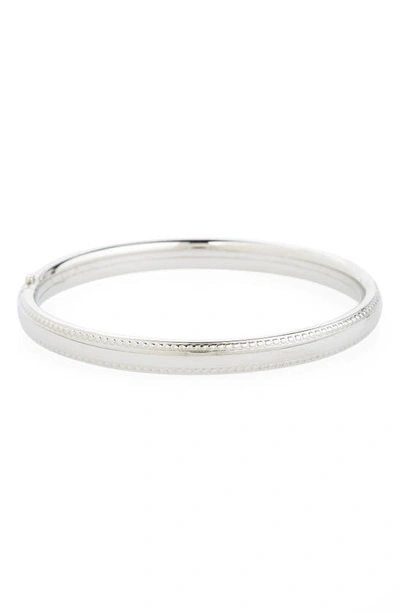 Beaded edges subtly texture a gleaming hinged bangle of polished sterling silver. Push-button spring hinge with safety band. Approx. circumference: 5 1/2". Approx. width: 1/8". Sterling silver. By Mignonette; made in the USA. Kids' Wear.