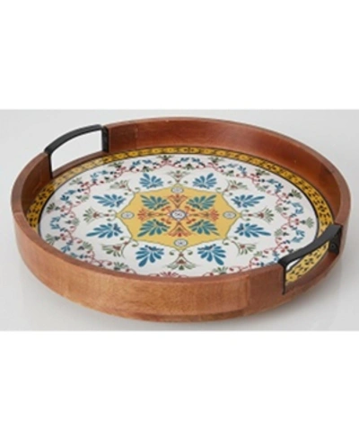 No more passing bowls, jars, and bottles around when you place this Gourmet Basics Medium Round Tiled Lazy Susan by Mikasa in the center of the dining table. Generously sized to accommodate several items at once, this round tray rotates to make anything resting on it easily accessible to guests with a simple spin. Made of mango wood with antique black iron handles and a stunning, colorful medallion design, this beautiful tray features a high wall to keep contents in place while it is spinning. Measures 2-3/4 inches tall and 16 inches in diameter. Wipe clean with a damp cloth. Other Home