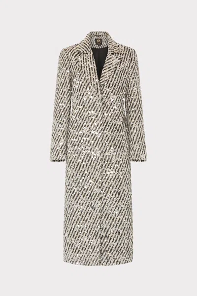 The "Wanda" coat from Milly is decorated with diagonal stripes glittering with sequins, designed in a long Aline silhouette Approx. 49"L from shoulders to hem Notched lapels; hidden snap front Long sleeves Hem falls below the knee Aline silhouette Polyester Lining: Polyester Dry clean Imported