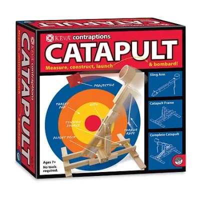 Learning takes on a whole new trajectory with the KEVA Catapult! Kids can build their own medieval siege engine with pre-drilled KEVA planks, a little glue and the help of easy, step-by-step "blueprint" instructions. Then let the fun and experimentation begin! The Catapult allows you to test launch distance by adjusting the arm recoil or the height of the flight deck. Everything you need to build the Catapult is in the box, no tools required! Finished size measures over 14" tall!Recommended Ages: 8 Years And UpUse: IndoorMeasurements: 8.5 Length/Inches, 3 Height/Inches, 8.5 Width/InchesBase Material: 95% Cardboard, 5% Other 5% Or LessCare: Wipe CleanCountry of Origin: Imported