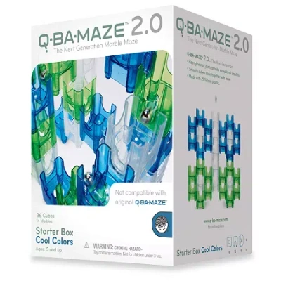Q-BA-MAZE 2.0 is a unique system of colorful cubes that interlock to form a marble run. The big difference? You can create marble maze sculptures in the form of animals, geometric shapes or any other design! Configurations are unlimited, allowing for unpredictable action when steel balls travel the various routes. It's a live demonstration of probability, physics and art, all in one! Starter Box includes 36 cubes and 14 marbles.Q-BA-MAZE 2.0 cubes are not compatible with original Q-BA-MAZE cubes. Reengineered joints provide exceptional stability. Smooth cubes slide together with ease. Made with 20% less plastic.# Pieces In Set: 50Recommended Ages: 8 Years And UpUse: IndoorMeasurements: 11 Height/Inches, 6 Width/Inches, 8 Length/InchesBase Material: 95% Cardboard, 5% Other 5% Or LessCare: Wipe CleanCountry of Origin: Imported