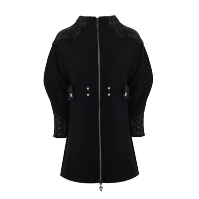 A wool black coat that has quilted details. Straight fit, can be fitted at belt as well. Metal zipper at front.