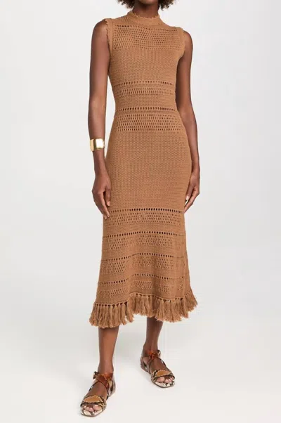 A midi dress so versatile, your options for wearing it are endless.Introducing the Amanda Dress by Misa Los Angeles in a sophisticated Fox hue, designed to turn heads at any dinner party. This sleeveless midi dress boasts a trendy sheath silhouette with a mock neck and fringe trim at the hem, perfect for embracing '90s fashion vibes. Crafted from a cotton blend of 95% cotton and 5% cashmere, this mid-weight stretch crochet piece is made in China, measuring 49.5 inches in length from shoulder. Closure - Button keyhole at the back. Care instructions - Hand wash.