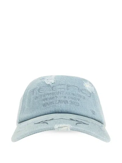 light blue pull-on style buckle-strap fastening embroidered logo to the front distressed effect