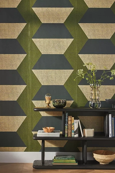 Infinity Blocks pays homage to Constantin Brâncuși's masterpiece sculpture, " Infinity Column". Need help choosing the right wallpaper for your home? [Read our guide]( https://www.anthropologie.com/stories-home-wallpaper-guide) to transforming your walls - and your space. To calculate the square footage of your space, we recommend combining the width of each wall, then multiplying this number by your ceiling height. Next, divide this number by the square footage of a single roll of wallpaper to determine the number of rolls required. Always round up to account for pattern repeat and variation. Infinity Blocks Wallpaper by Mitchell Black in Green at Anthropologie