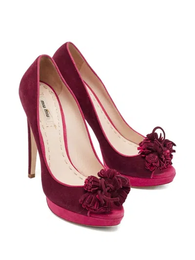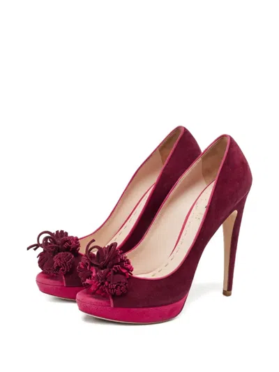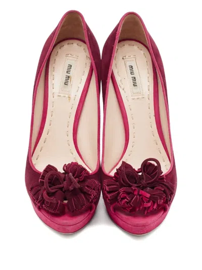 dark pink leather fringe detailing slip-on style high stiletto heel platform sole branded insole open toe Condition: GOOD. This previously owned and used item is in good condition with minimal signs of use. This may include fading of material or plating and scratches.