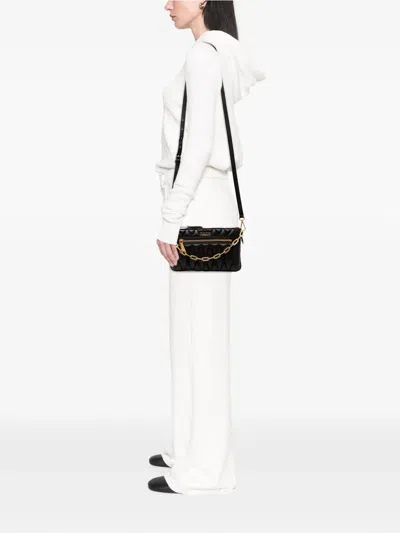 This satchel features a quilted leather body, a chain link strap, a detachable flat leather strap, a top zip closure, and exterior zip and flap pockets. Black. Inclusions: shoulder strap. Condition: GOOD. This previously owned and used item is in good condition with minimal signs of use. This may include fading of material or plating and scratches. Due to the exclusivity of this item and its limited availability, processing and delivery might take longer than usual. Please refer to the photos on this product page for a detailed view of the item, including any damages declared.