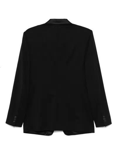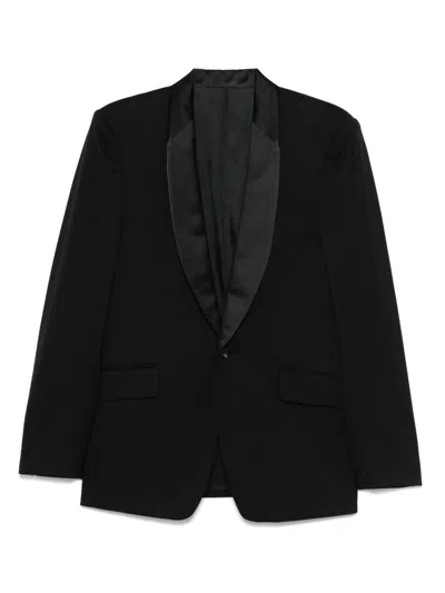 circa 2010s black silk patterned jacquard shawl lapels satin trim shoulder pads long sleeves front button fastening dart detailing two side flap pockets Italian rear vents internal pocket full lining