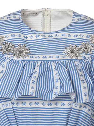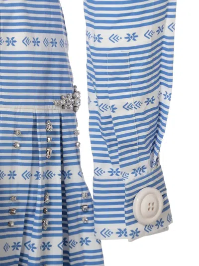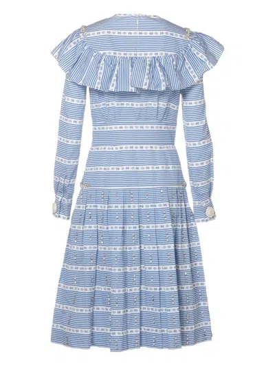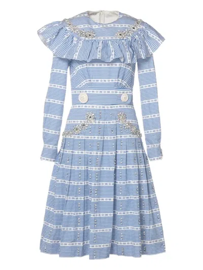 circa 2015 sky blue/white cotton horizontal stripe pattern crystal embellishment round neck ruffled detailing long sleeves buttoned cuffs decorative button detailing rear zip fastening flared hem Condition: GOOD. This previously owned and used item is in good condition with minimal signs of use. This may include fading of material or plating and scratches.