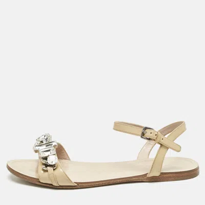 Pre-owned Beige Patent Leather Cipraia Crystal Ankle Strap Flat Sandals Size 37.5