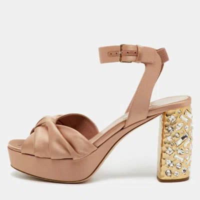 Pre-owned Beige Satin Crystal Embellished Block Heel Platform Ankle Strap Sandals Size 40