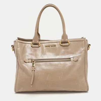 Understated shine meets practical design in this beige satchel from Miu Miu. Crafted from supple Vitello leather with a structured silhouette its a chic companion for work or the weekend.
