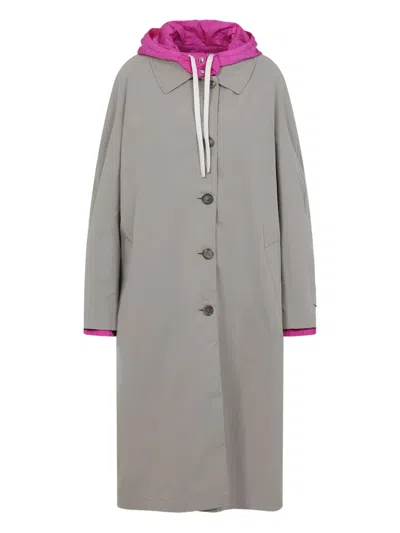 Miu Miu Clay Grey Cotton Coat. Grey cotton coat, multilayered and reversible design, pointed collar, front buttoned fastening, side pockets, long sleeves, straight hem. Purple azalea polyester lining, purple azalea adjustable hood, inner zipped pockets.