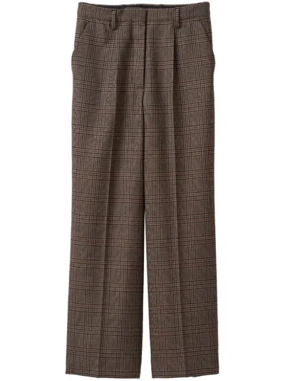 brown wool Prince of Wales check pattern belt loops concealed front fastening two side slit pockets rear button-fastening jetted pocket embroidered logo to the rear straight leg