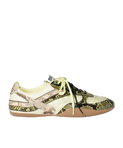 Miu Miu Nylon & Ayers Sneaker in Yellow Snakeskin leather and technical fabric. Made in Italy. Lace-up closure. Rubber sole with logo. Screen-printed logo on the tongue and heel collar. Removable fabric-covered insole. Logo-embossed rubber outsole. Flat heel. MIUF-WZ222. 5E428E. About the designer: Established in 1992 by Miuccia Prada, Miu Miu reflects fashion forward, light-hearted, and provocative women. The language of Miu Miu experiments with contemporary femininity, merging rebelliousness with minimalism in order to evoke a sense of freedom within luxury fashion. As a member of the Prada family, Miu Miu is made for those who aspire to add a flair of the avant-garde to their lifestyle.