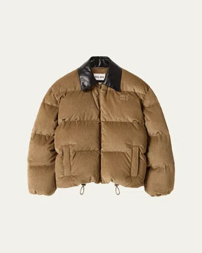 MIU MIU Leather-collar Corduroy Puffer Jacket In Burgundy