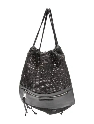 Miu Miu Backpack Black Mesh Silver-Tone Hardware Leather Trim Dual Shoulder Straps Leather Trim Embellishment & Single Exterior Pocket Unlined Drawstring Closure at Top Includes Authenticity Card | Miu Miu Mesh Drawstring Backpack in Black