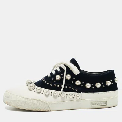 Pre-owned Navy Blue/white Velvet Faux Pearl Embellished Low Top Sneakers Size 39