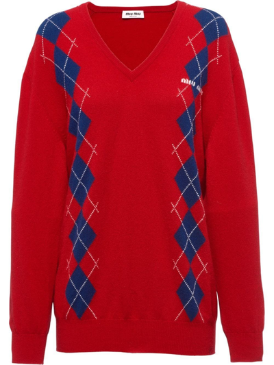 MIU MIU Oversized Argyle V-neck Wool Sweater In Red