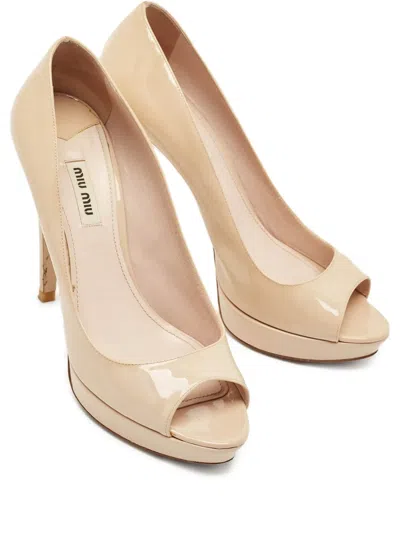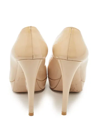 light beige calf leather patent finish leather sole branded leather insole peep toe Condition: GOOD. This previously owned and used item is in good condition with minimal signs of use. This may include fading of material or plating and scratches.