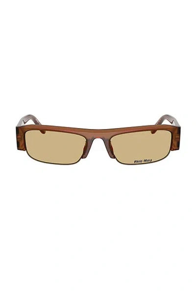 Miu Miu Rectangular Sunglasses in Brown - Tan. Size all. Acetate frame. Made in Italy. Beige lens. Lens measures approx 51mm. Bridge measures approx 17mm. Arm measures approx 140mm. 100% UVA / UVB protection. Frame compatible with graduated lenses. MIUF-WG98. 8056262723791. About the designer: Established in 1992 by Miuccia Prada, Miu Miu reflects fashion forward, light-hearted, and provocative women. The language of Miu Miu experiments with contemporary femininity, merging rebelliousness with minimalism in order to evoke a sense of freedom within luxury fashion. As a member of the Prada family, Miu Miu is made for those who aspire to add a flair of the avant-garde to their lifestyle.