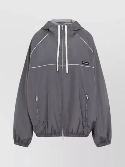 MIU Miu Grey Polyester Jacket. Grey recycled polyester, white contrasting piping details, adjustable hood with drawstring, two-way zip on the front, branded label on the breast, zip pockets on the front, raglan long sleeves, elastic cuffs and hem. Composition: Polyester 76%RECYCLED POLYESTER 24%SILK Country Of Origin: ItalyBuy this luxury Blazers today!