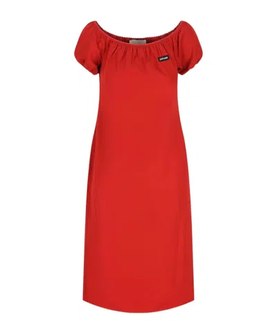 It features an elastic boat neck and off-the-shoulder design, a tag on the chest, and a slit at the back.