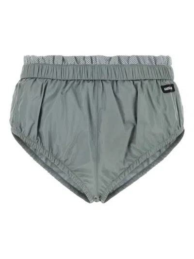 Miu Miu Hot Short in Grey Self: 76% recycled polyester 24% silk Lining: 100% recycled polyester. Made in Italy. Dry clean only. Elastic waistband. Front logo detail. Ripstop fabric. MIUF-WF28. SP9465. About the designer: Established in 1992 by Miuccia Prada, Miu Miu reflects fashion forward, light-hearted, and provocative women. The language of Miu Miu experiments with contemporary femininity, merging rebelliousness with minimalism in order to evoke a sense of freedom within luxury fashion. As a member of the Prada family, Miu Miu is made for those who aspire to add a flair of the avant-garde to their lifestyle.