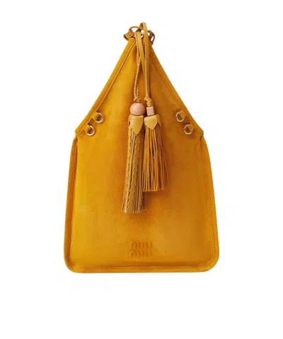 Removable tassels---Gold-tone hardware---Suede interior with patch pocket---Embossed lettering logo on the front