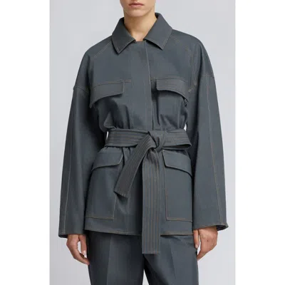 Layer up your everyday style with the effortless sophistication of this belted nylon jacket. Front button closure Point collar Front flap pockets Removable tie belt 57% cotton, 32% polyester, 11% elastane Dry clean or machine wash, dry flat Imported