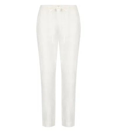 Mara trousers by MM Max Mara made of white cotton. Characterized by an elasticized waist, it features a straight cut and pressed crease. Equipped with side welt pockets. Regular fit. The appearance and different shades of the product should be considered a true characteristic of the finishing treatment of the garment. Composition: 96% cotton, 4% elastane.