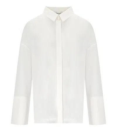 Sedan shirt by MM Max Mara made of jersey in white color, characterized by a pointed collar. It features a hidden button closure on the front of the garment, distinguished by a slight transparency. It has wide kimono-style sleeves with small side slits and dropped shoulders with a cropped cut on the front. Asymmetrical hem on the back of the garment finished with side slits. Oversized fit. Composition: 60% polyester, 40% cotton.