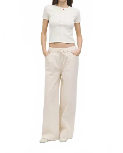 Introducing the Iris Wide Leg Pants by MOD REF in a chic bone color, perfect for women seeking a polished, laid-back look. With a relaxed fit and flattering wide leg, these pants are crafted from 100% cotton with a denim fabrication for breathability and comfort. Featuring a secure pull-on closure with an elasticized waistband, they include practical side and back pockets. Care instructions - Machine wash, tumble dry. Model Renee is 5'9" and wearing a size S (31" bust, 24" waist, 33 ½" hips).