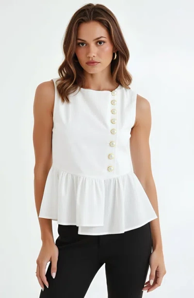 MODENAIRE Sleeveless Peplum Top With Asymmetric Pearl Button Front In White