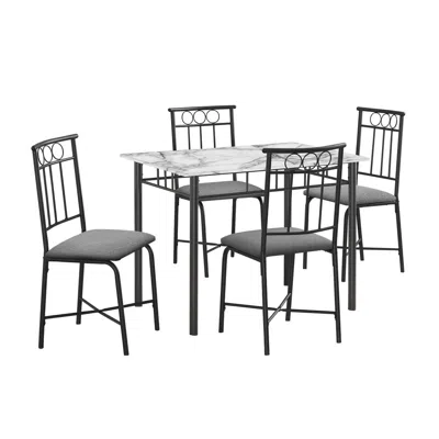 Welcome a casual family dining experience with this modern 5 piece set dining table set! It features a 40 rectangular dining table with a stunning white marble look laminate top and a sturdy black metal base for a chic contemporary style. Perfect for a small kitchen or dining area this space saving set easily accommodates up to 4 people. The armless chairs are upholstered in a thick grey cotton and linen mix fabric with matching black metal accents to provide comfortable seating for any meal. Easy to assemble with illustrated instructions and hardware included this dining set also comes with a 2 year limited warranty against manufacturer's defects to ensure your satisfaction. Enjoy a fashionable reliable and easy to clean dining table set that will last through many dinner parties and family meals.