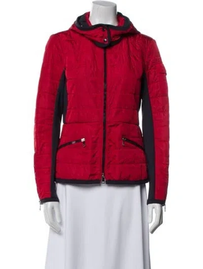 Moncler Biker Jacket Red With Hood Embroidered Accent & Stand Collar Zip Pockets & Zip Closure Designer size 3. Fit: Jackets by Moncler typically fit true to size. | Moncler Biker Jacket in Red, Women's XS