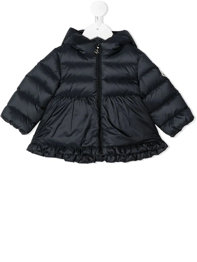 Midnight blue flared puffer coat from Moncler Enfant featuring a quilted effect, padded, a hood, a front zip fastening, long sleeves and front pockets.