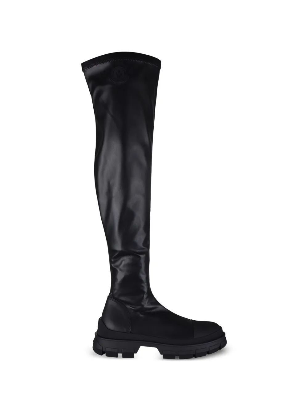 Moncler Hevea high boots in black polished synthetic leather. Rubber logo patch on visible side. Zipper on inner side. Round rubber toe. Suede lining. Logo on heel. Rubber notched sole. 4 cm height. Knee-high boots. Made in Italy.