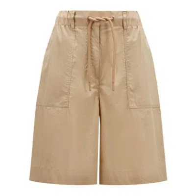 Moncler Ladies Bottoms. Fashion category: Shorts. SKU: I10932B00008-596OT-20X. Color: Beige. Moncler Logo-Patch Drawstring Shorts. These shorts are crafted from lightweight cotton poplin and nylon, featuring a waistband with a drawstring fastening, a zipper and snap button closure, a logo patch, and patch pockets. 66% Cotton, 34% Polyamide / Nylon.