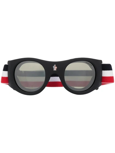 Black acetate round goggle sunglasses from MONCLER EYEWEAR featuring round frame, grey tinted lenses, striped fabric strap with adjustable fastening and logo at the bridge. We know you'll look after them, but these glasses come with protection, just in case.